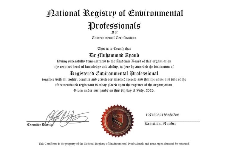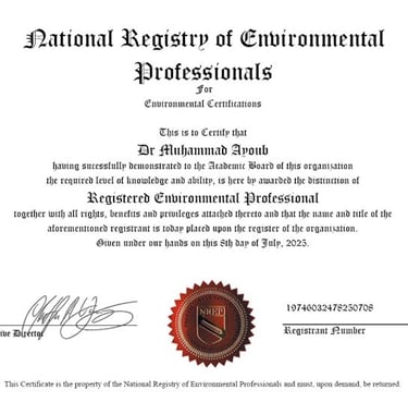 Nextgen Carbon Solution is proud to announce that our own Dr. Muhammad Ayoub has been awarded the title of Registered Environmental Professional (REP) by the National Registry of Environmental Professionals (NREP, USA). This esteemed credential underscores Dr. Ayoub’s profound commitment to sustainable practices, environmental protection, and responsible engineering leadership.